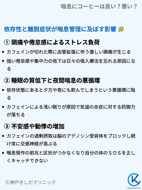 カフェインが切れた時に起こる離脱症状は、直接的に喘息を悪化させるわけではありませんが、体調不良を引き起こし、間接的に喘息の管理を難しくします。主な影響は以下の通りです。