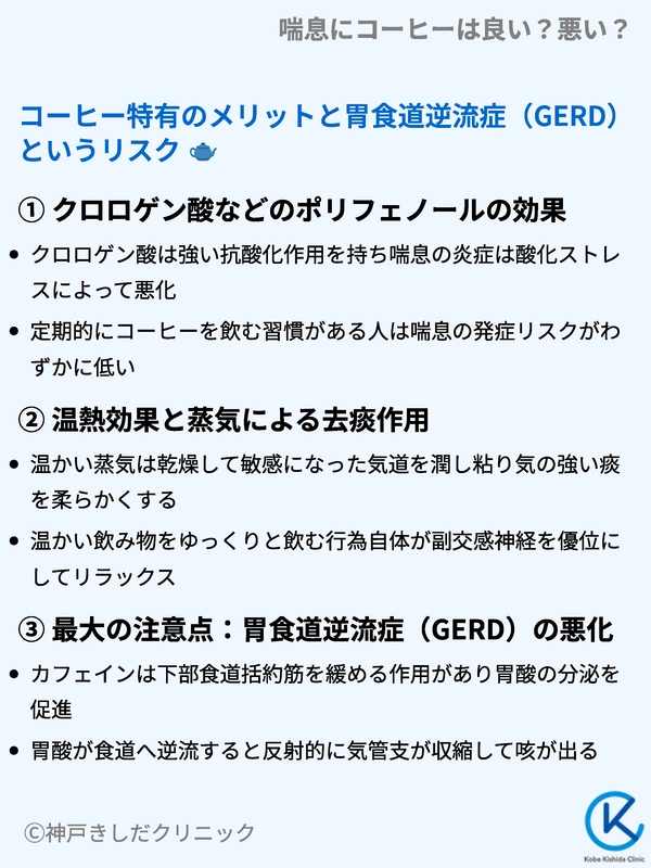 温かいコーヒーの湯気がもたらす一時的な緩和効果と、胃酸逆流によって咳が悪化するリスクのバランスを理解することが、喘息管理において非常に重要です。