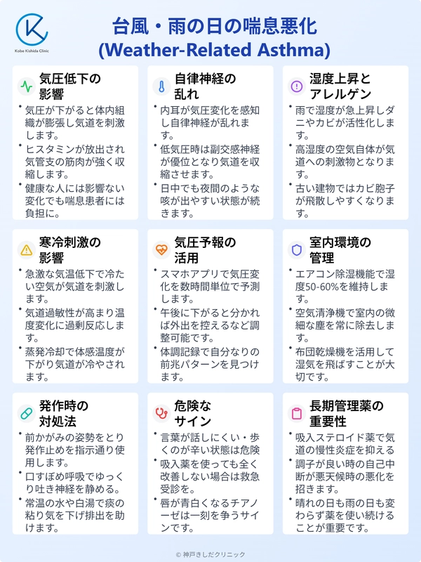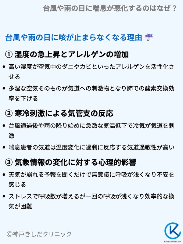 台風の通過後や雨の降り始めには、急激に気温が下がる場合があります。冷たい空気はそれ自体が強力な気道刺激物(トリガー)となります。