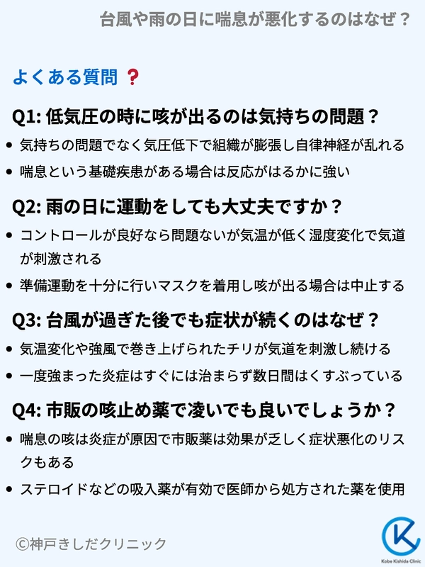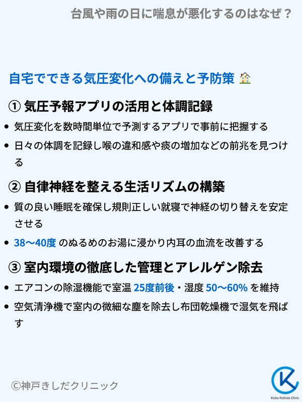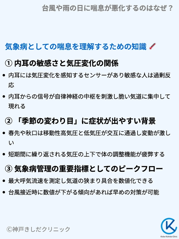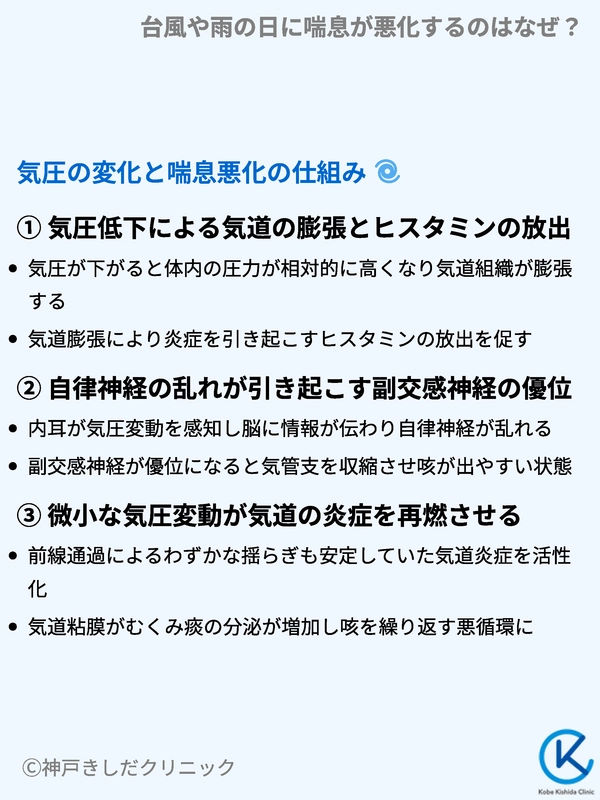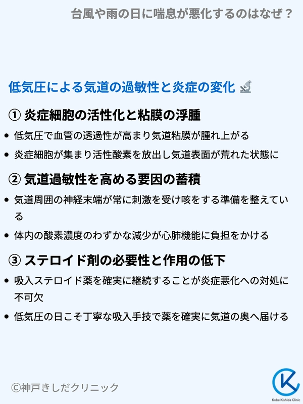 台風や雨の日などの悪天候時に喘息症状が悪化するのは、気圧の低下が気道を直接刺激し、慢性的な炎症を強めるからです。