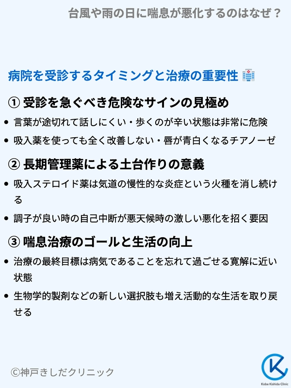 もし台風のたびに寝込んでしまうようなら、現在の治療内容を見直す良い機会かもしれません。命に関わる事態を防ぐための受診目安を確認しましょう。