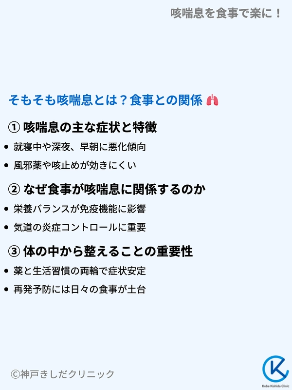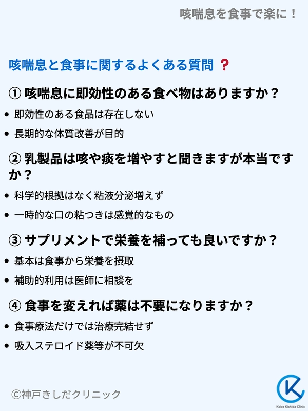咳喘息の根本には気道の炎症があり、これを抑えるためには吸入ステロイド薬などの薬物療法が不可欠です。食事改善は、あくまで治療のサポート役と位置づけてください。