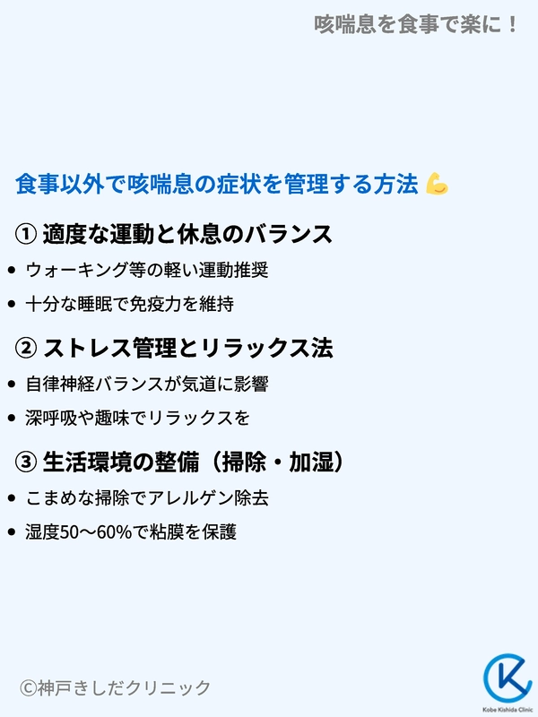 食事療法は咳喘息管理の一部です。より良い状態を維持するためには他の生活習慣にも目を向ける必要があります。
