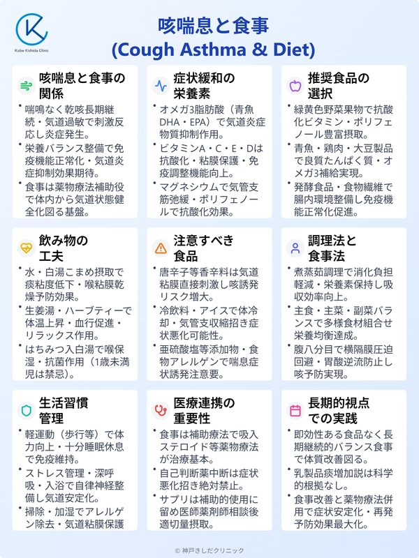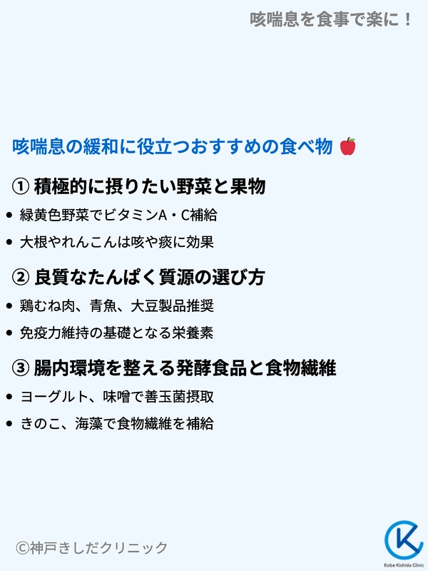 この記事では咳喘息の症状緩和を目指すために日々の食事で意識したい食べ物や飲み物、そして具体的な食事の工夫について詳しく解説します。
