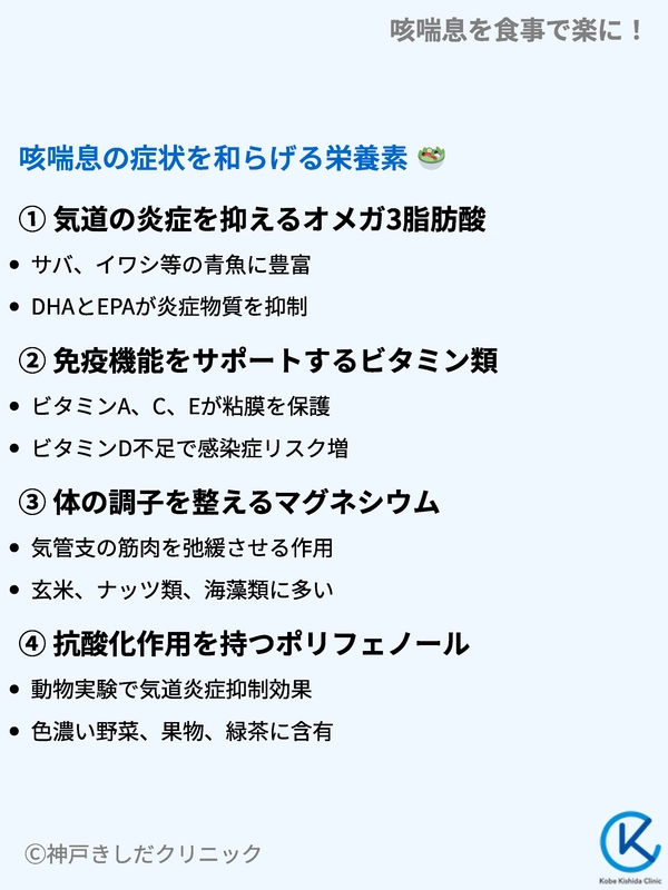 咳喘息の症状緩和には気道の炎症を抑えたり、免疫機能を正常に保ったりする栄養素を意識して摂ることが役立ちます。