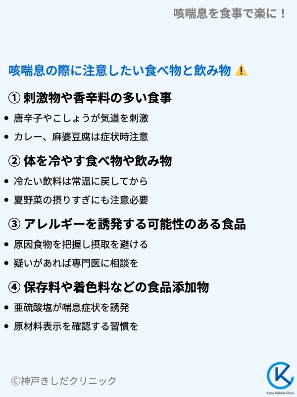 | 冷たいもの | アイスクリーム、氷入りの飲料 | 体を冷やし、気管支の収縮を招くことがあります。 |