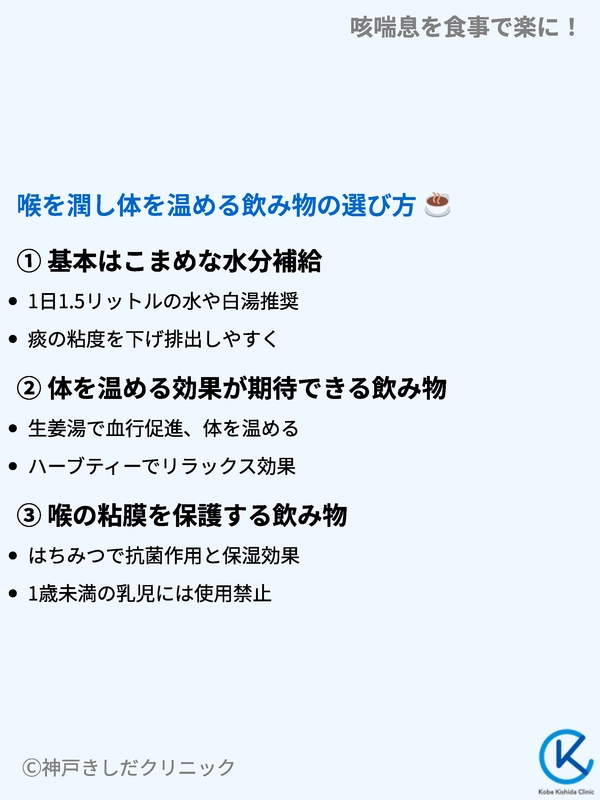 特に冷たい飲料は一気に飲むと気管支を刺激するため、常温に戻してからゆっくり飲むなどの工夫が必要です。