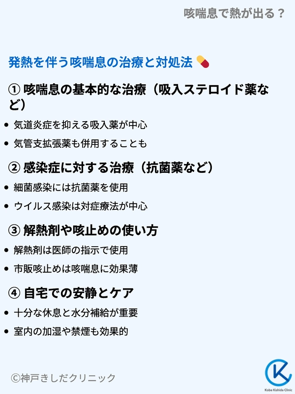 咳喘息で発熱がある場合の治療は咳喘息そのものに対する治療と発熱の原因(主に感染症)に対する治療を並行して行うことが基本です。