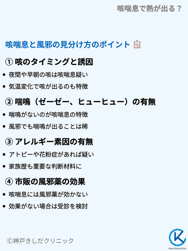 咳喘息は基本的に発熱を伴いませんが、時に熱が出ることがあり、風邪との区別がつきにくいことがあります。
