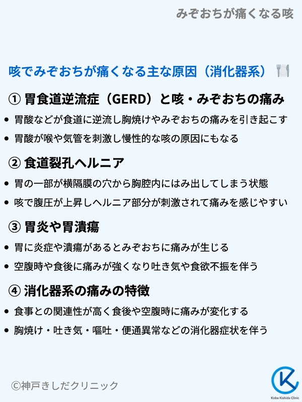 | 胃食道逆流症 (GERD) | 胸焼け、みぞおちの灼熱感 | 胃酸による咳誘発、咳で腹圧上昇し痛み増強 |