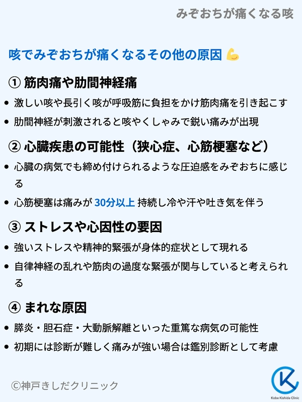 また、心因性の咳(精神的な要因が主な原因で起こる咳)がある場合、その咳自体がみぞおちの痛みを引き起こすこともあります。