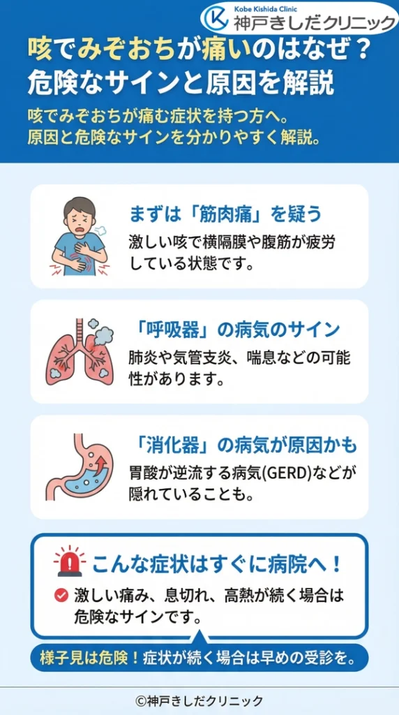 これは「咳のしすぎでみぞおちが痛い」と感じる最も一般的な原因の一つです。