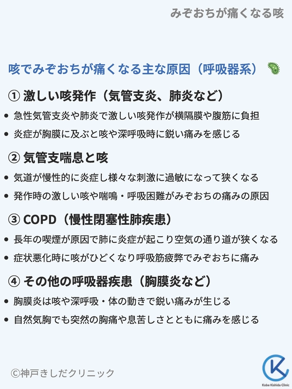 咳そのものが呼吸器系の症状であるため、みぞおちの痛みが呼吸器の病気に由来することも少なくありません。「咳をするとみぞおちが痛い」場合、まず呼吸器系の疾患を考慮します。