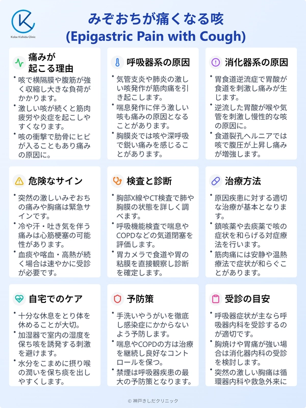 みぞおち周辺には咳に使われる主要な筋肉である横隔膜や腹直筋が付着しているため、咳の動作が直接的な負担となり、痛みが生じやすいのです。