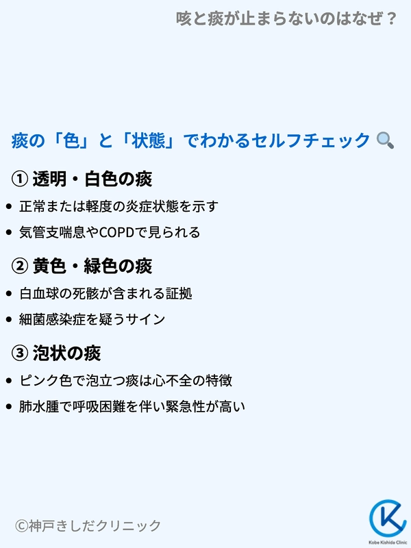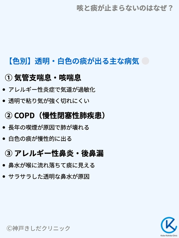 | 透明・白色 | 非感染性、軽度の炎症 | 気管支喘息、COPD、かぜ症候群初期 |