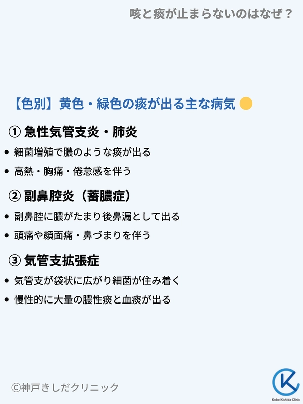 | 黄色・緑色 | 細菌感染 | 肺炎、急性気管支炎、副鼻腔炎 |