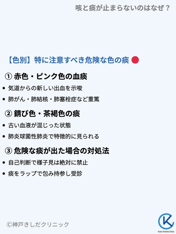 | 鮮やかな赤色 | 肺がん、肺結核、気管支拡張症 | 速やかに呼吸器内科を受診 |