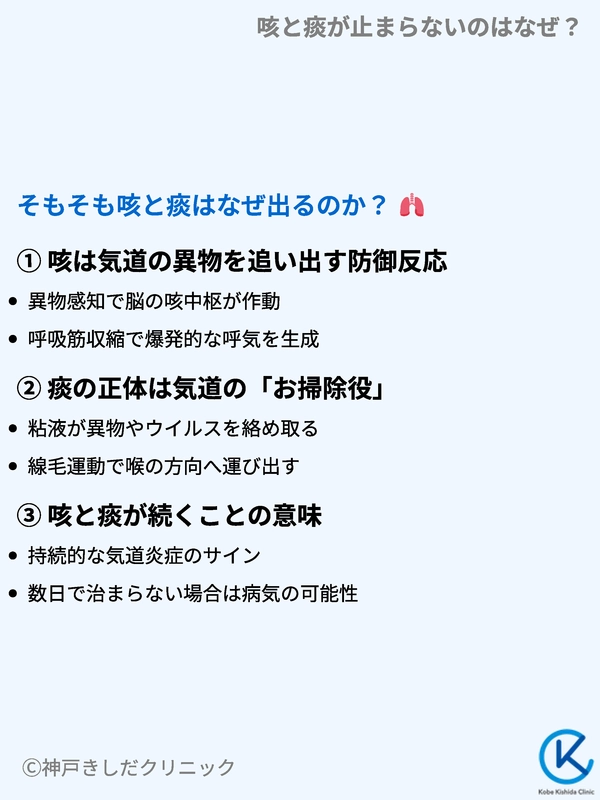 咳と痰は体を守るための大切な防御反応です。それぞれの役割と、なぜ症状が続くのかを理解しましょう。