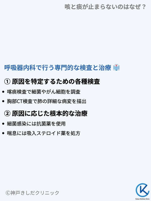 必要に応じて喀痰検査で痰の中の細菌や細胞を詳しく調べたり、CT検査で肺をより詳細に観察したりします。