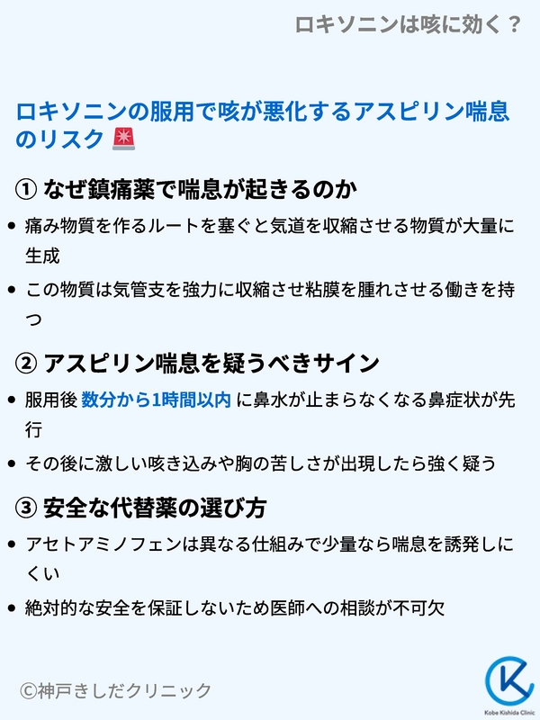 むしろ、体質によってはロキソニンを服用すると激しい咳を引き起こす「アスピリン喘息」を誘発する恐れがあるため、咳がひどい時の安易な服用には注意を払わなければなりません。