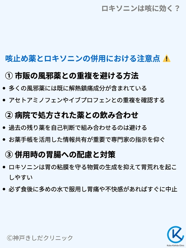 多くの市販の咳止め薬や総合風邪薬には、既に解熱鎮痛成分が含まれている場合があり、そこにロキソニンを足してしまうと成分の重複を招きます。