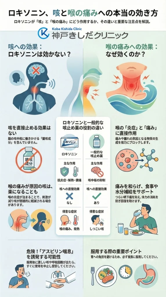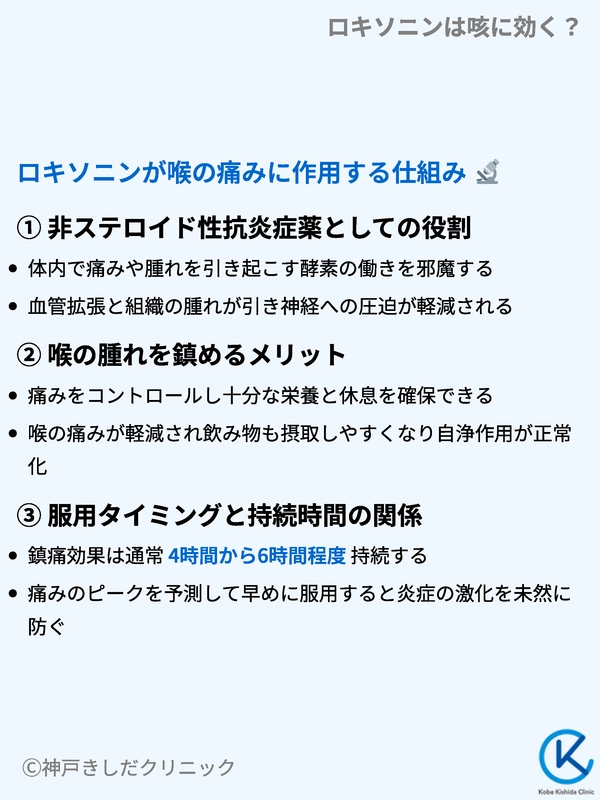喉の痛みが主症状であれば、炎症を抑える目的でロキソニンを服用するのは有効な選択肢です。喉の痛みが和らぐため、その刺激による反射的な咳が軽減される場合もあります。
