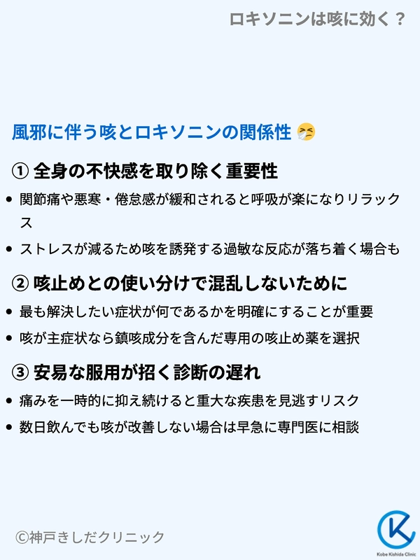 つまり、ロキソニンは咳に対する特効薬ではないものの、風邪という戦いを乗り切るためのコンディション作りにおいては、頼もしい存在です。