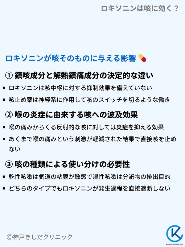 ロキソニンには咳中枢に作用して咳を止める成分が含まれていないからです。ロキソニンは主に痛みや炎症を抑える薬であり、咳の発生源に直接作用するわけではありません。