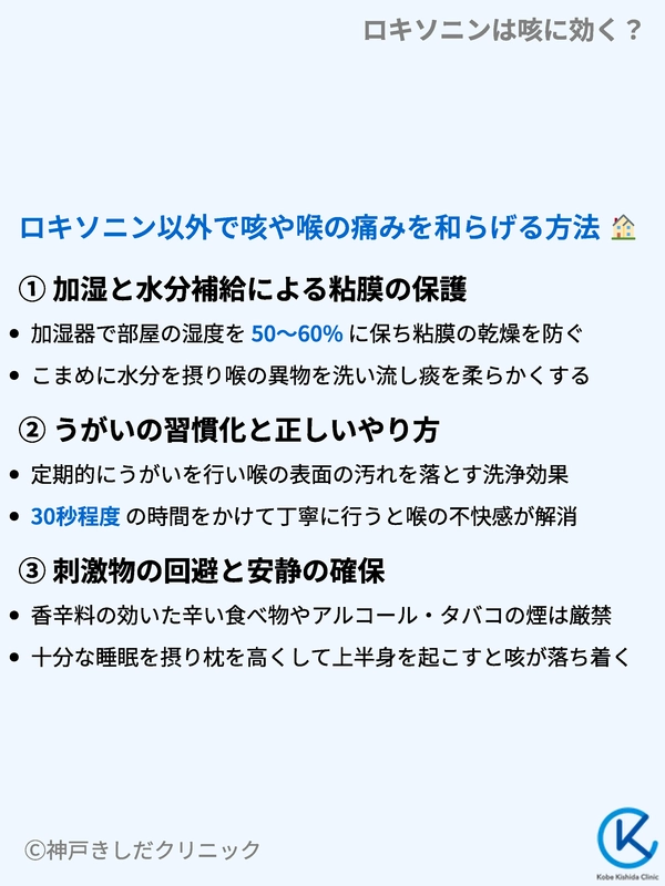 咳や喉の痛みが辛い時、ロキソニンのような内服薬だけに頼らずとも、日常生活の中での工夫によって症状を大幅に緩和できます。粘膜を優しくいたわるケアが、回復を早める助けとなります。