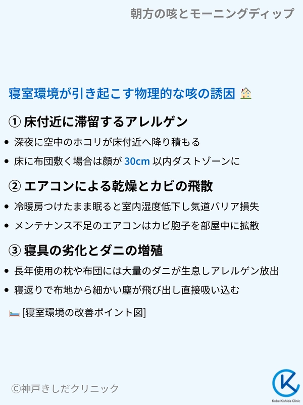 明け方に寝返りを打つと、床に積もった微細なアレルゲンが一気に舞い上がり、咳を爆発させる原因となります。
