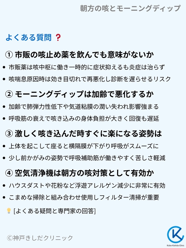 - Q朝の咳き込みがひどい時、すぐに楽になる姿勢や方法はありますか?