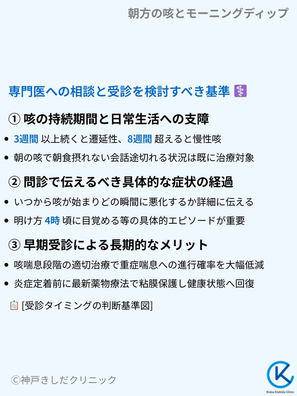 朝方の咳が一時的なものではなく、生活の質を損なわせているのであれば、適切なタイミングで医療機関を頼るのが賢明です。
