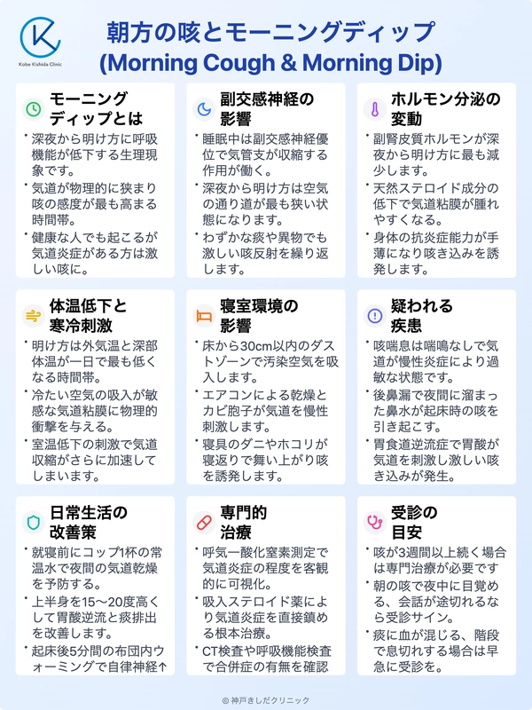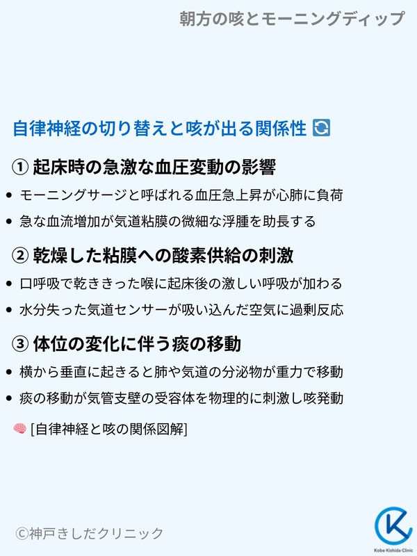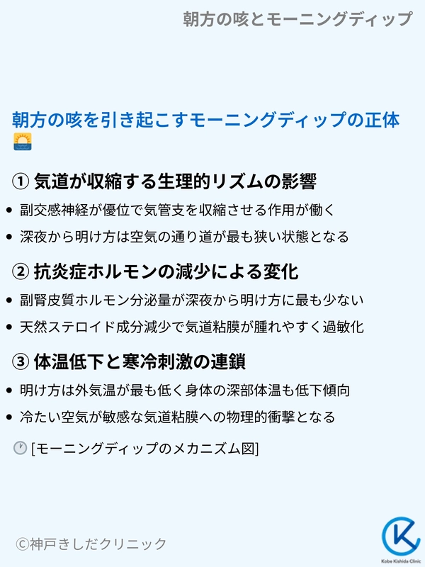 朝方に咳が止まらない主な理由は、体温や呼吸機能が低下する「モーニングディップ」という生理現象にあります。