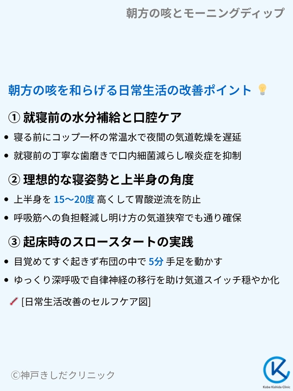 朝方の咳を軽減するためには、就寝前のわずかな習慣の見直しと、起床時の丁寧な身体の動かし方が鍵となります。