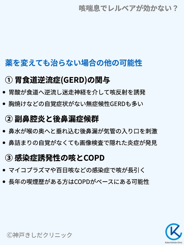 レルベアからフルティフォームへ変更し、正しい吸入方法を実践してもなお咳が止まらない場合、そもそも診断が「純粋な咳喘息」ではない、あるいは他の病気が合併している可能性を疑う必要があります。