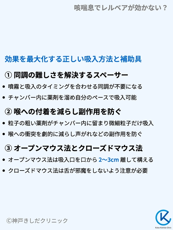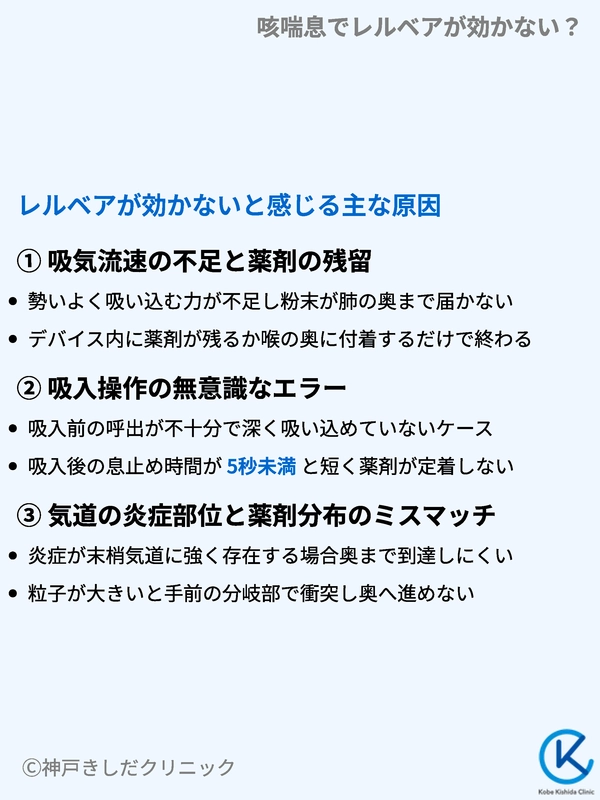 レルベアを使用していても咳が止まらない場合、主な原因は薬剤の成分不適合ではなく、薬剤が患部に物理的に届いていない「吸入過誤」や「到達不全」にあります。