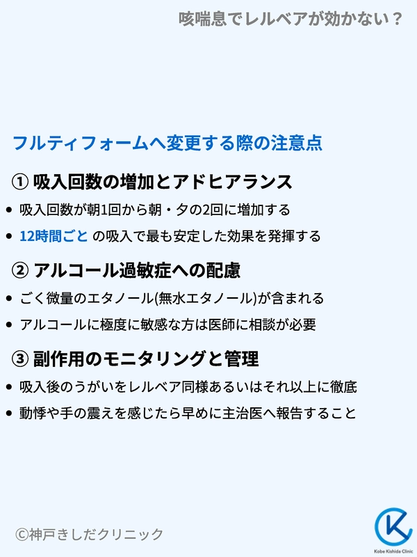 レルベアからフルティフォームへの切り替えは多くのメリットをもたらしますが、1日1回から2回への回数変更に伴う生活リズムの調整や、添加物に含まれるアルコールへの配慮など、事前に理解しておくべき注意点があります。