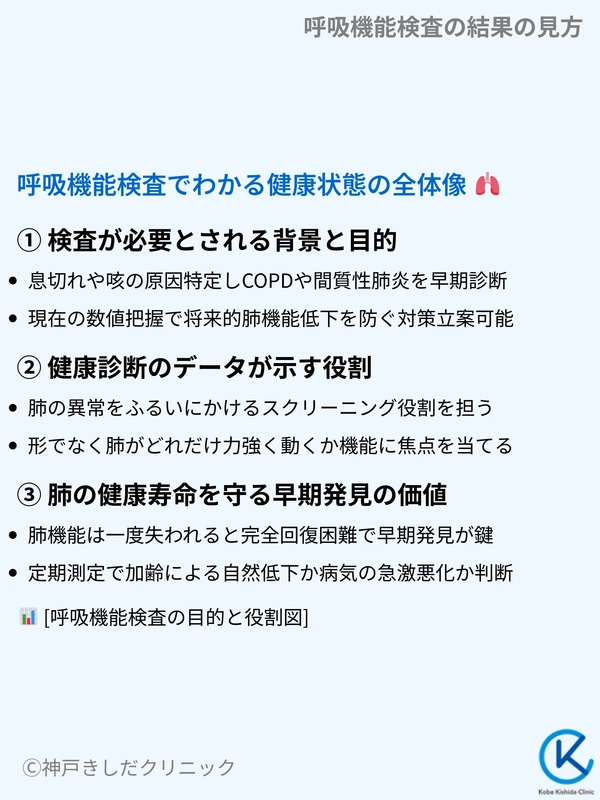特に喫煙習慣がある方や、日常的に息苦しさを感じる方にとって、この検査は健康状態を客観的に示す羅針盤のような存在です。