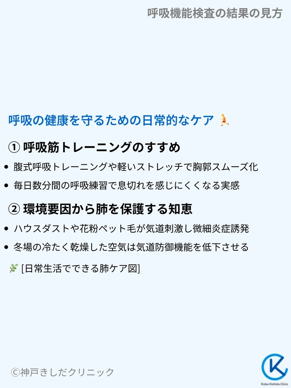 自分に合った対策を日常に取り入れると、呼吸機能検査の数値を安定させ、将来にわたって健やかな肺を維持することにつながります。