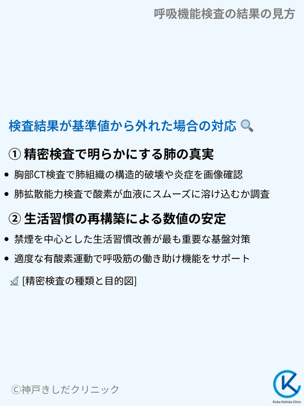 数値が基準から外れている場合、肺が十分に広がっていないか、あるいは空気が通りにくくなっているかのいずれかが疑われます。