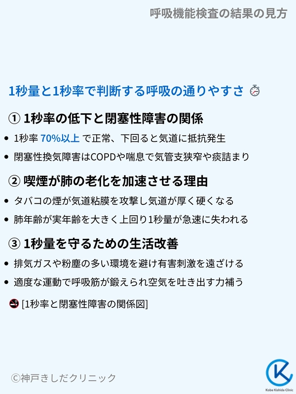 1秒率は、肺にある空気を最初の1秒間に何%吐き出せるかを示す数値で、気道の通りやすさを評価するための重要な指標です。