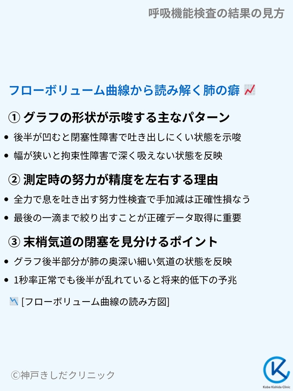 医師はこのグラフの形状を確認し、肺のどこに問題が起きているかを瞬時に判断します。数値と視覚情報の両面から分析を行うことが大切です。