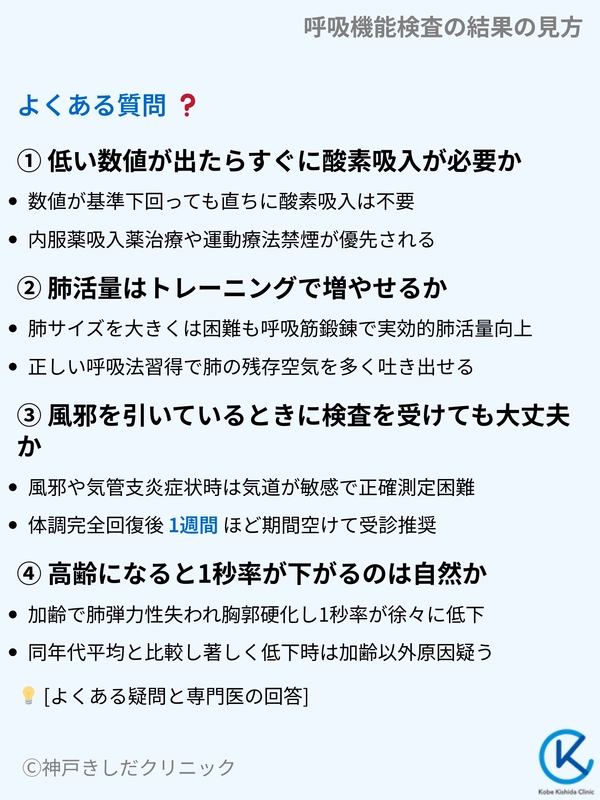 しかし、同年代の平均と比較して著しく低下している場合は、加齢以外の原因が隠れている可能性があるため、呼吸器専門医による詳しい診察が必要となります。