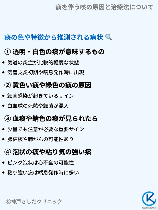 しかし、咳が長期間続いたり、痰の量や性状に異常が見られたりする場合は何らかの病気が隠れている可能性があるため注意が必要です。