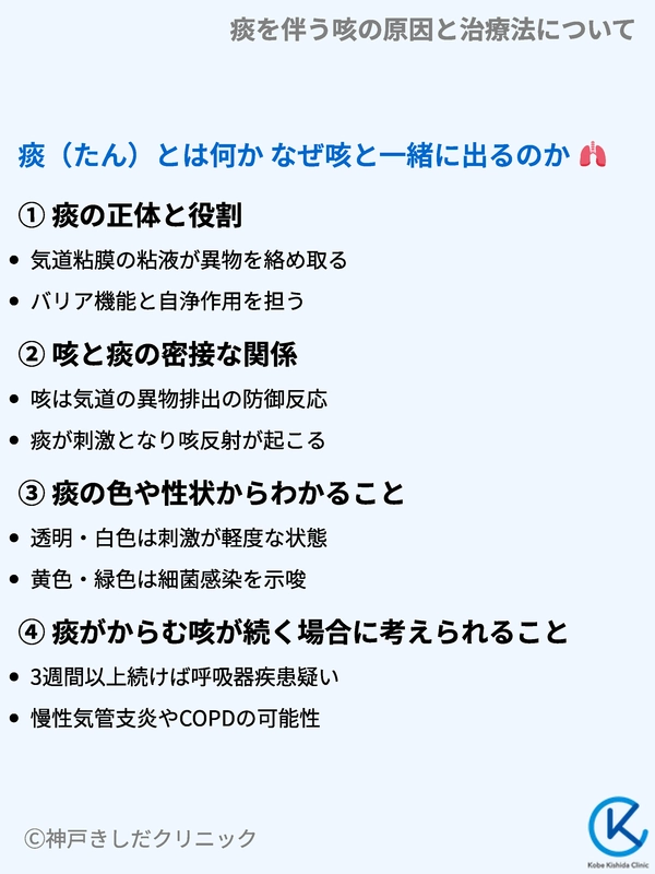 痰を伴う咳は風邪などの一時的なものから、慢性的な呼吸器疾患のサインであることまで様々です。