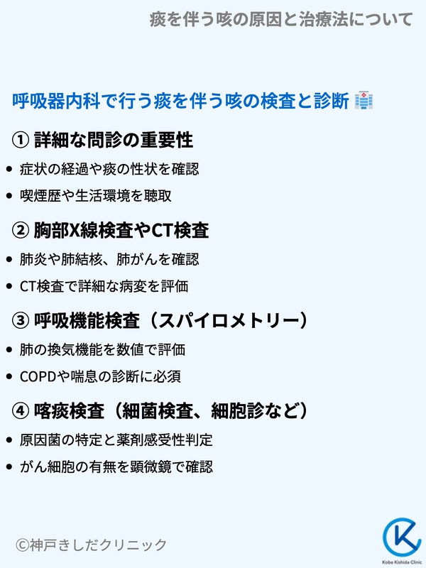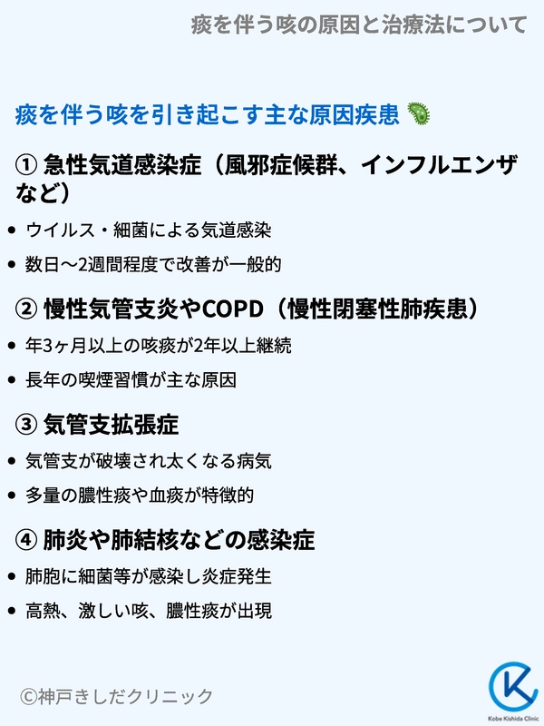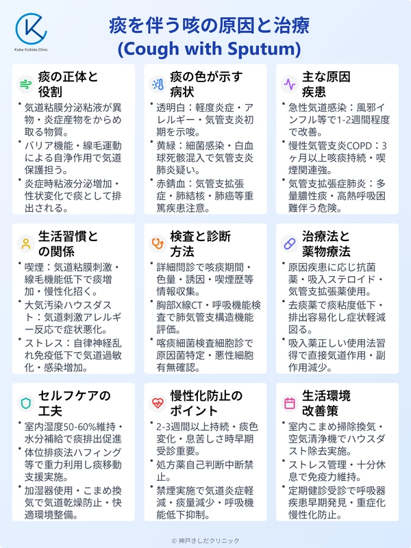 痰を伴う咳はさまざまな呼吸器の病気によって引き起こされます。原因となる疾患を正しく診断し、適切な治療を行うことが重要です。