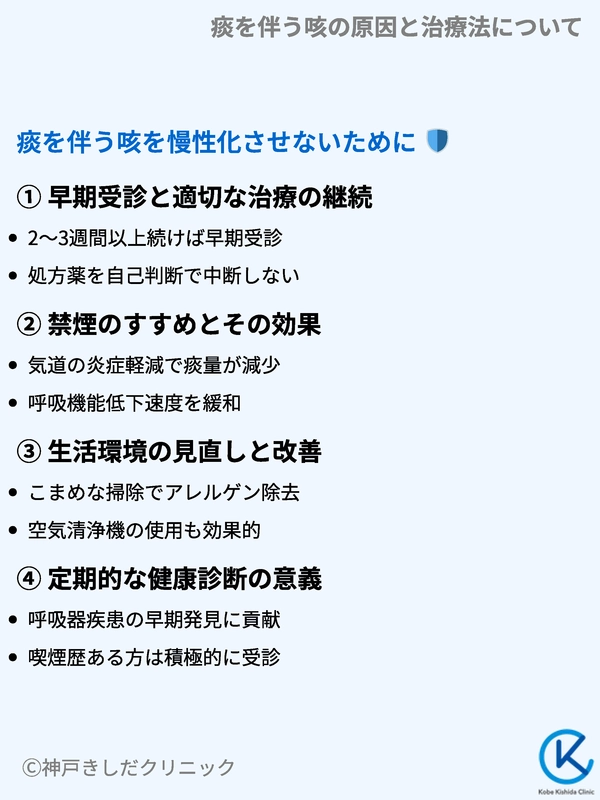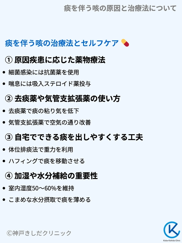 それに加えて、痰を出しやすくするための対症療法や日常生活でのセルフケアも重要になります。