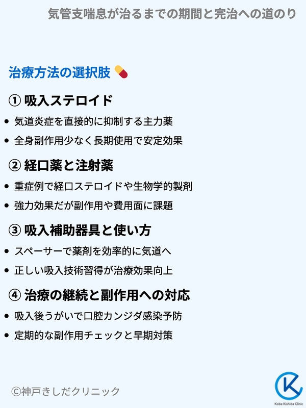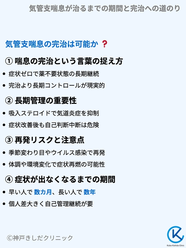 ただし喘息は基本的に完治が難しい慢性疾患であり、多くの場合『完全に治った』と断言するより長期コントロールが重要と考えられています。