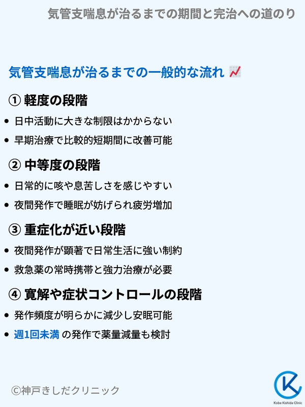 気管支喘息が治るという言葉を聞くと全く症状が出ない状態を想像しがちですが、現実には段階的に症状が変化します。