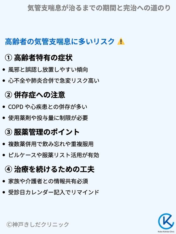 高齢者 | 併存症が増え、呼吸機能が落ちやすい | こまめな通院と適切な薬物管理が要る |